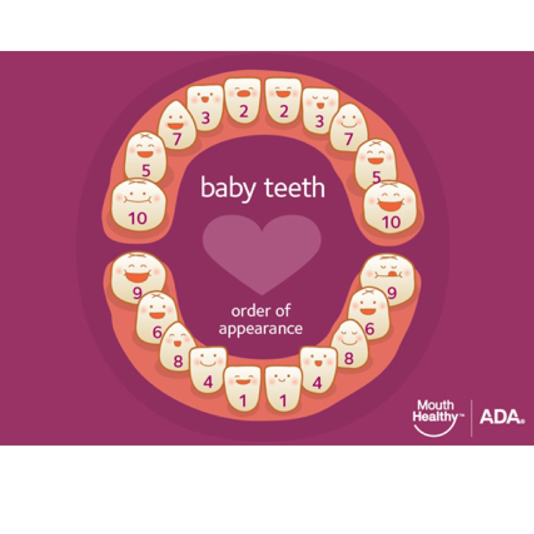 A baby develops their teeth (known as “primary teeth”) between 6 months to 1 year of age. Usually by the age of 3, children have their full set of 20 primary teeth. It is typical for the first few teeth to become exposed through the gum tissue in the front of the mouth. Some remedies to help ease the pain of teething include rubbing the baby’s gums with a clean finger, a teething ring, or even, a cool spoon.